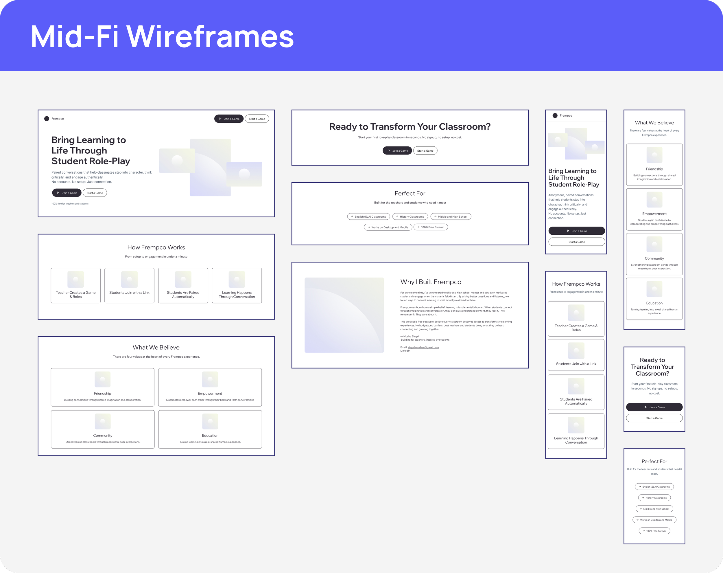 This design reinforces Frempco’s core idea: whether you’re a teacher or a student, there’s only one simple next step, and nothing standing in the way.