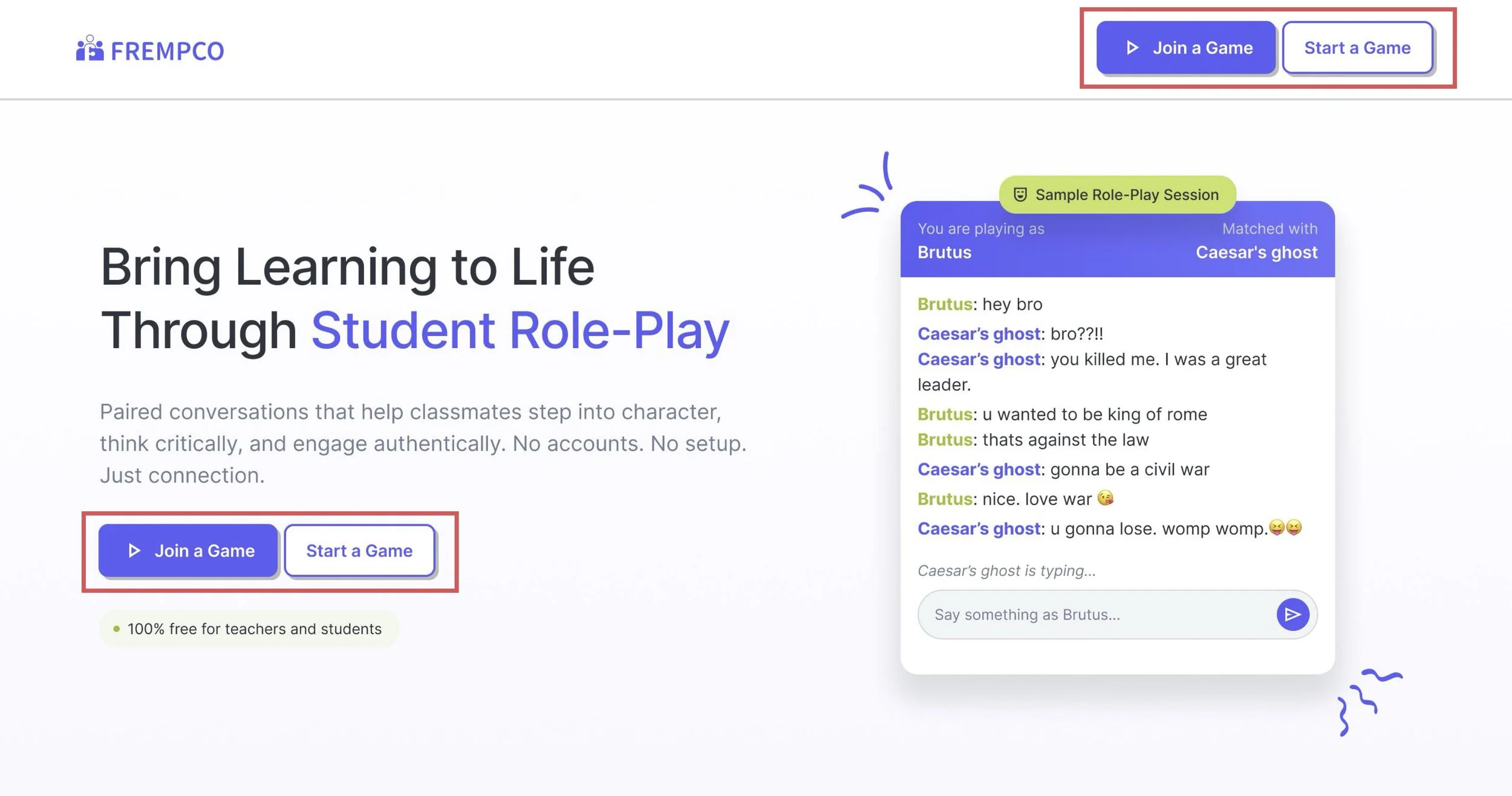 Frempco is a free, teacher-first EdTech SaaS product that uses role-play and conversation to bring English and History lessons to life. With a single link and no setup, students engage through dialogue while teachers get clear, reviewable insight into how learning unfolds.